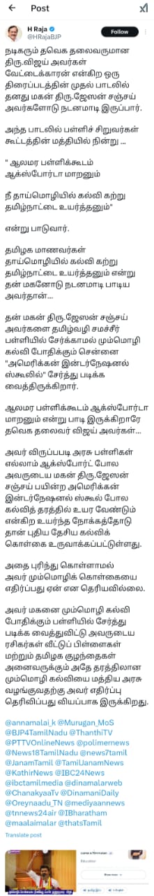 In a statement shared on his social media platform ‘X’, H. Raja questioned Vijay’s stance, pointing out what he called a contradiction between the actor’s public statements and personal choices regarding education.